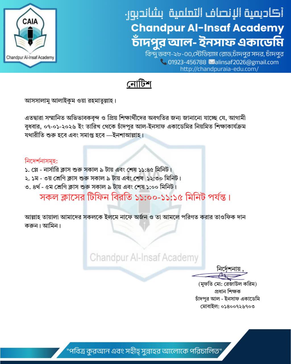 চাঁদপুর আল-ইনসাফ একাডেমি – নতুন শিক্ষাবর্ষের উদ্বোধন নোটিশ